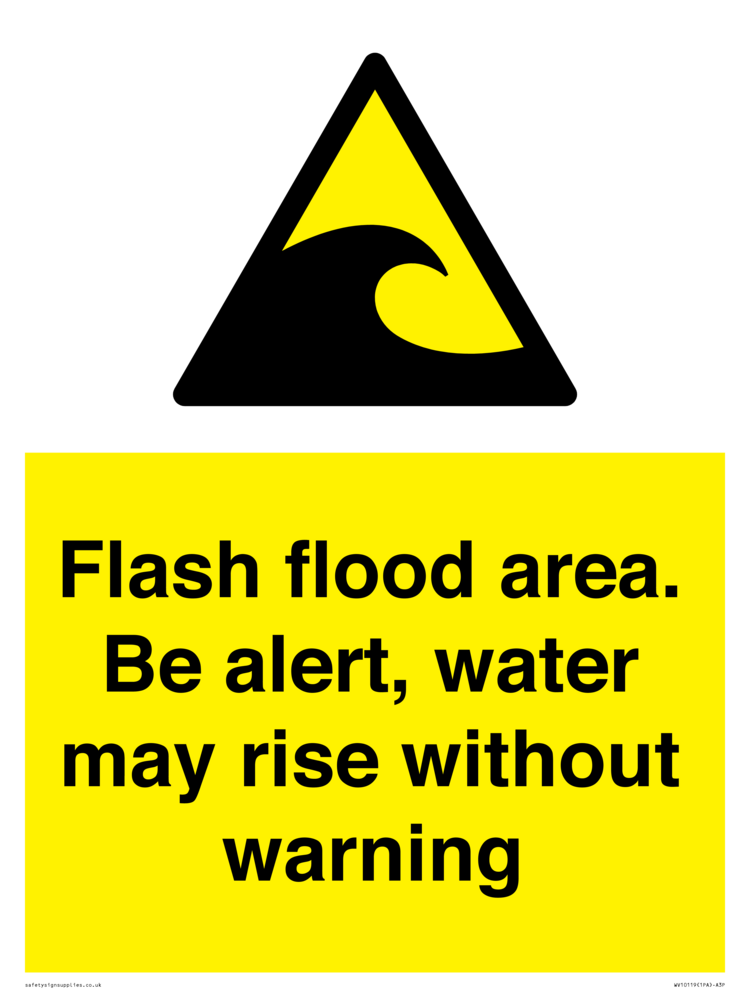 Sign Text: Flash flood area. Be alert, water may rise without warning