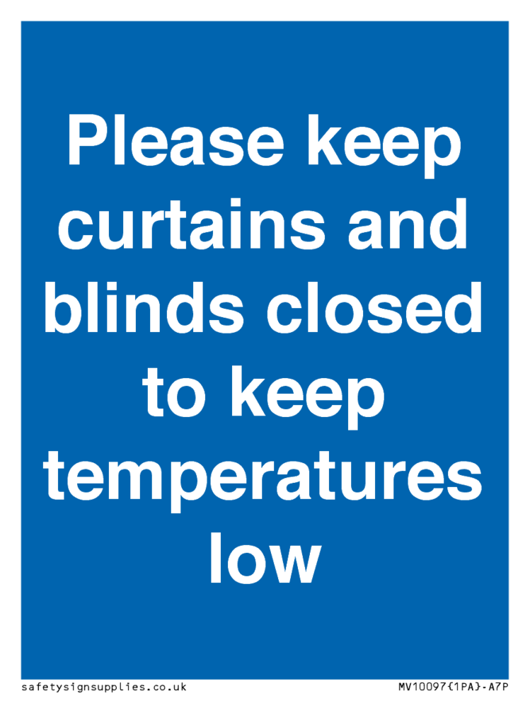 Sign Text: Please keep curtains/blinds closed to keep temperatures low
