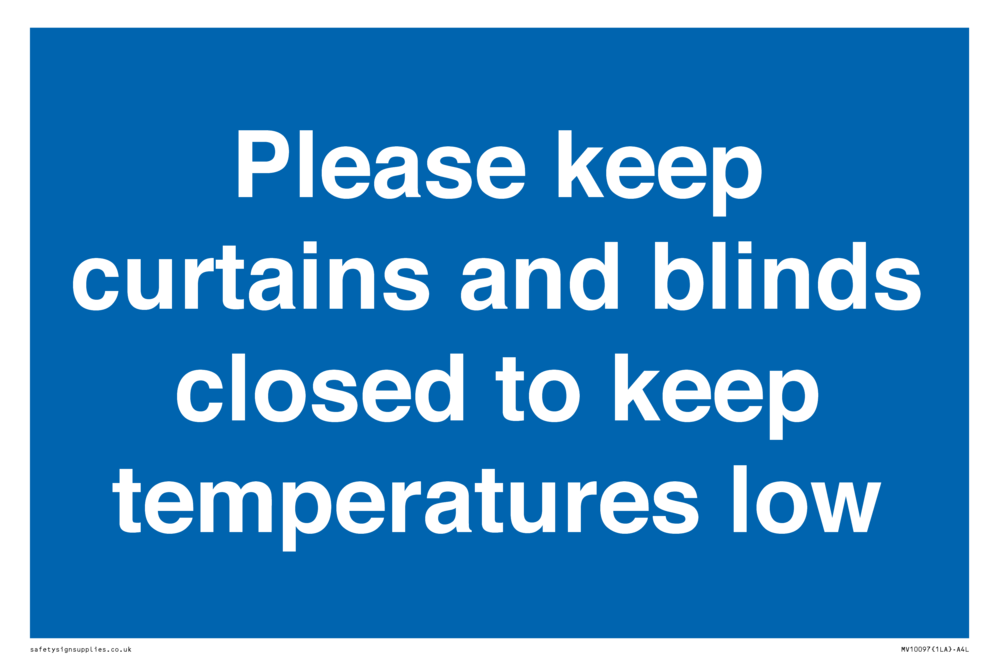 Sign Text: Please keep curtains/blinds closed to keep temperatures low