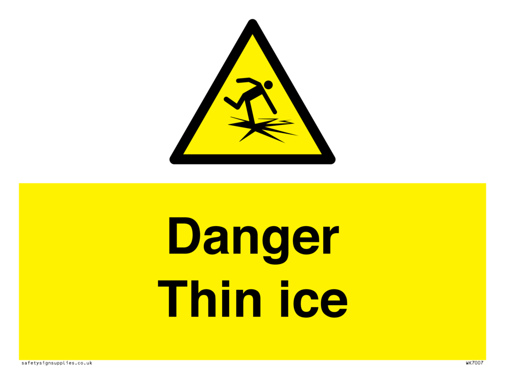 This sign contains a thin ice warning symbol. It's function is to warn of going onto thin ice. It contains a human figure falling, with radiating pattern originating from end of leg. The person is in black on a yellow warning triangle with black border.
