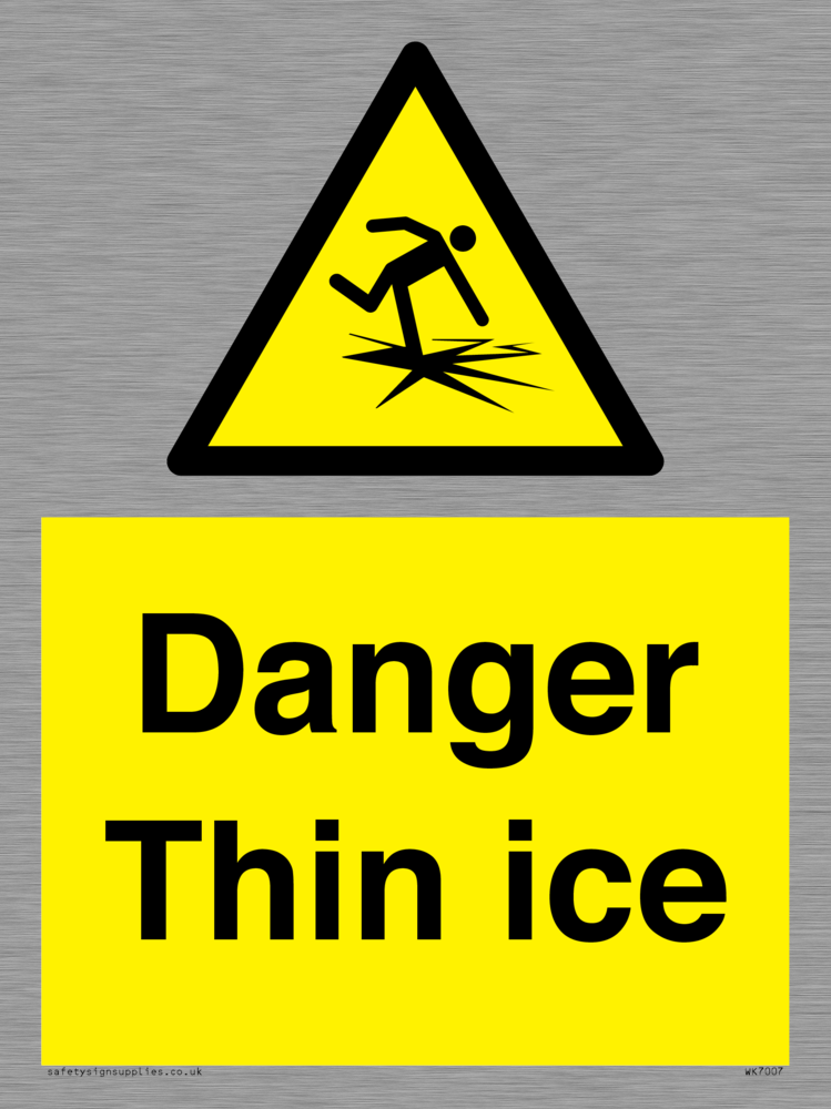 This sign contains a thin ice warning symbol. It's function is to warn of going onto thin ice. It contains a human figure falling, with radiating pattern originating from end of leg. The person is in black on a yellow warning triangle with black border.