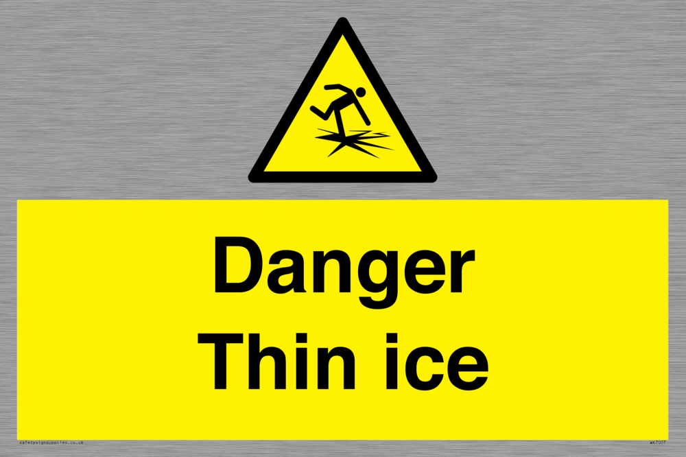 This sign contains a thin ice warning symbol. It's function is to warn of going onto thin ice. It contains a human figure falling, with radiating pattern originating from end of leg. The person is in black on a yellow warning triangle with black border.