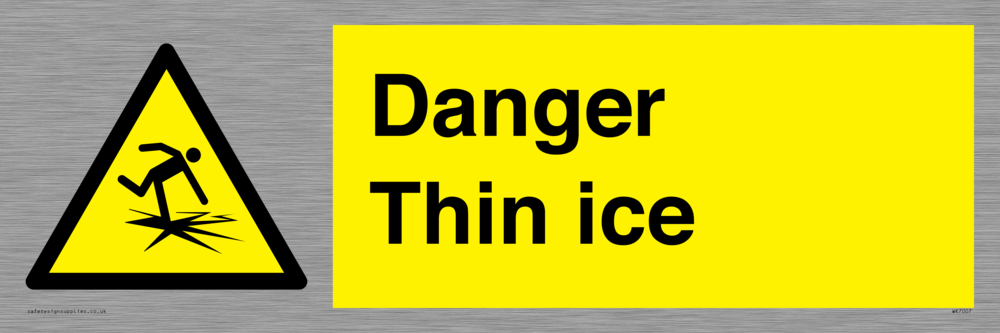 This sign contains a thin ice warning symbol. It's function is to warn of going onto thin ice. It contains a human figure falling, with radiating pattern originating from end of leg. The person is in black on a yellow warning triangle with black border.