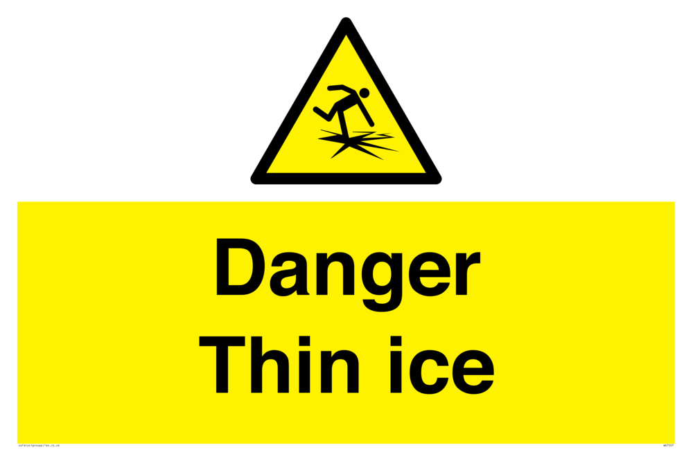 This sign contains a thin ice warning symbol. It's function is to warn of going onto thin ice. It contains a human figure falling, with radiating pattern originating from end of leg. The person is in black on a yellow warning triangle with black border.