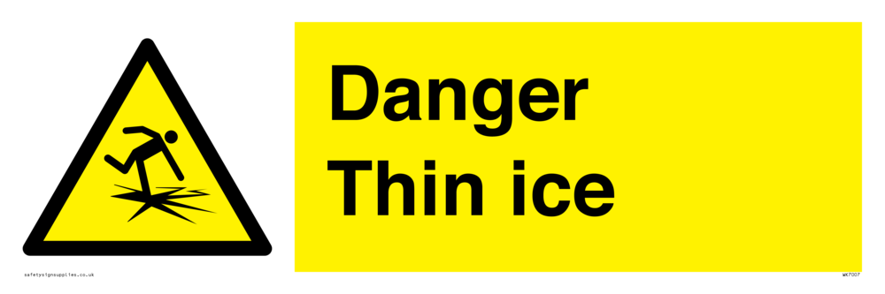 This sign contains a thin ice warning symbol. It's function is to warn of going onto thin ice. It contains a human figure falling, with radiating pattern originating from end of leg. The person is in black on a yellow warning triangle with black border.