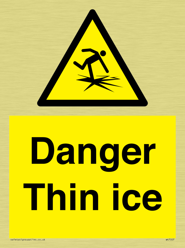 This sign contains a thin ice warning symbol. It's function is to warn of going onto thin ice. It contains a human figure falling, with radiating pattern originating from end of leg. The person is in black on a yellow warning triangle with black border.