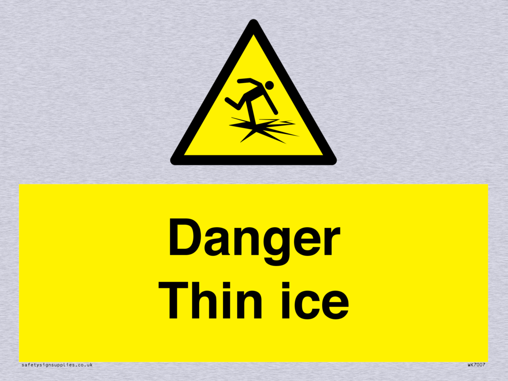 This sign contains a thin ice warning symbol. It's function is to warn of going onto thin ice. It contains a human figure falling, with radiating pattern originating from end of leg. The person is in black on a yellow warning triangle with black border.