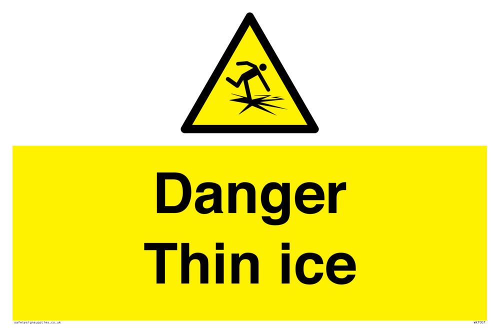 This sign contains a thin ice warning symbol. It's function is to warn of going onto thin ice. It contains a human figure falling, with radiating pattern originating from end of leg. The person is in black on a yellow warning triangle with black border.
