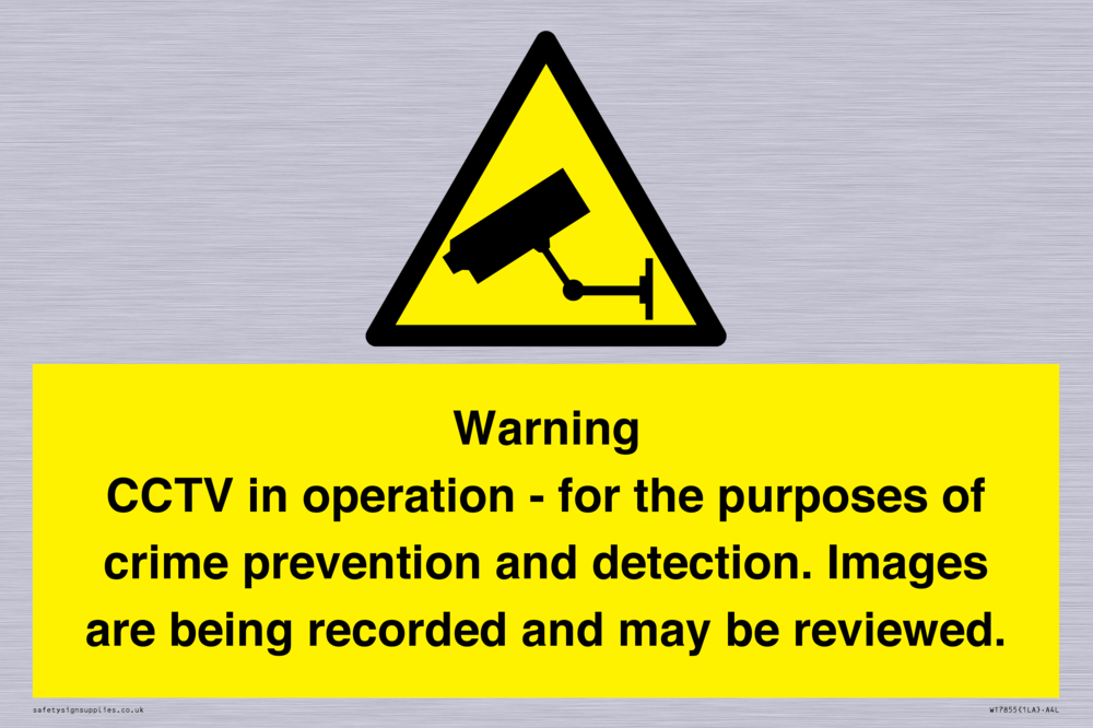 Warning CCTV in operation - for the purposes of crime prevention and detection. Images are being recorded and may be reviewed. Sign