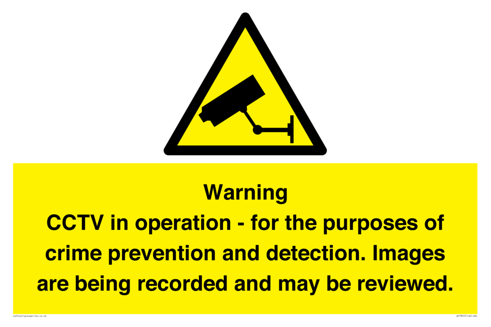 Sign Text: Warning CCTV in operation - for the purposes of crime prevention and detection. Images are being recorded and may be reviewed.