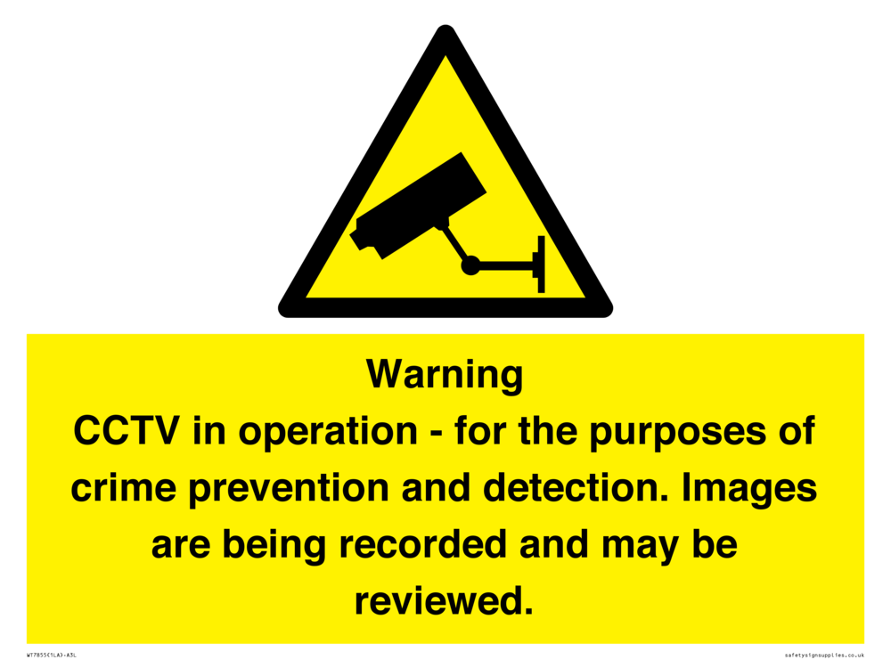 Sign Text: Warning CCTV in operation - for the purposes of crime prevention and detection. Images are being recorded and may be reviewed.