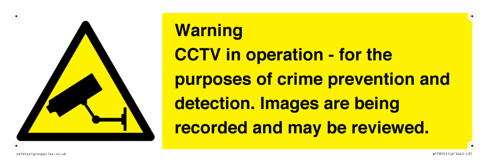 Sign Text: Warning CCTV in operation - for the purposes of crime prevention and detection. Images are being recorded and may be reviewed.