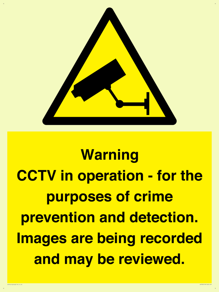 Sign Text: Warning CCTV in operation - for the purposes of crime prevention and detection. Images are being recorded and may be reviewed.