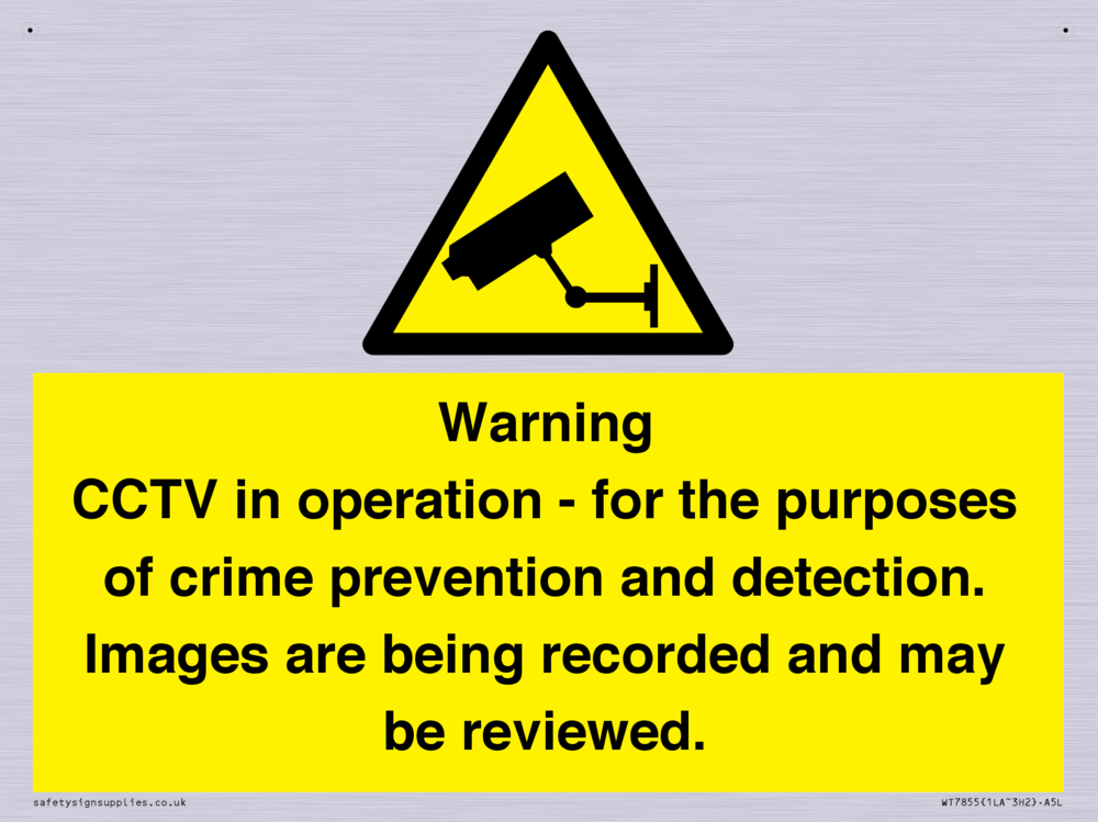 Sign Text: Warning CCTV in operation - for the purposes of crime prevention and detection. Images are being recorded and may be reviewed.