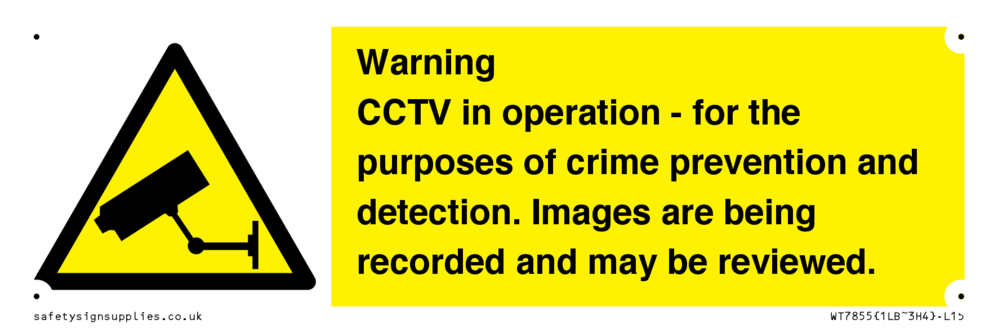 Sign Text: Warning CCTV in operation - for the purposes of crime prevention and detection. Images are being recorded and may be reviewed.