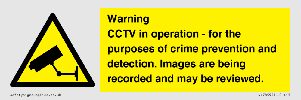 Sign Text: Warning CCTV in operation - for the purposes of crime prevention and detection. Images are being recorded and may be reviewed.