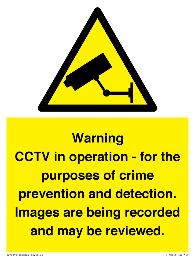 Sign Text: Warning CCTV in operation - for the purposes of crime prevention and detection. Images are being recorded and may be reviewed.