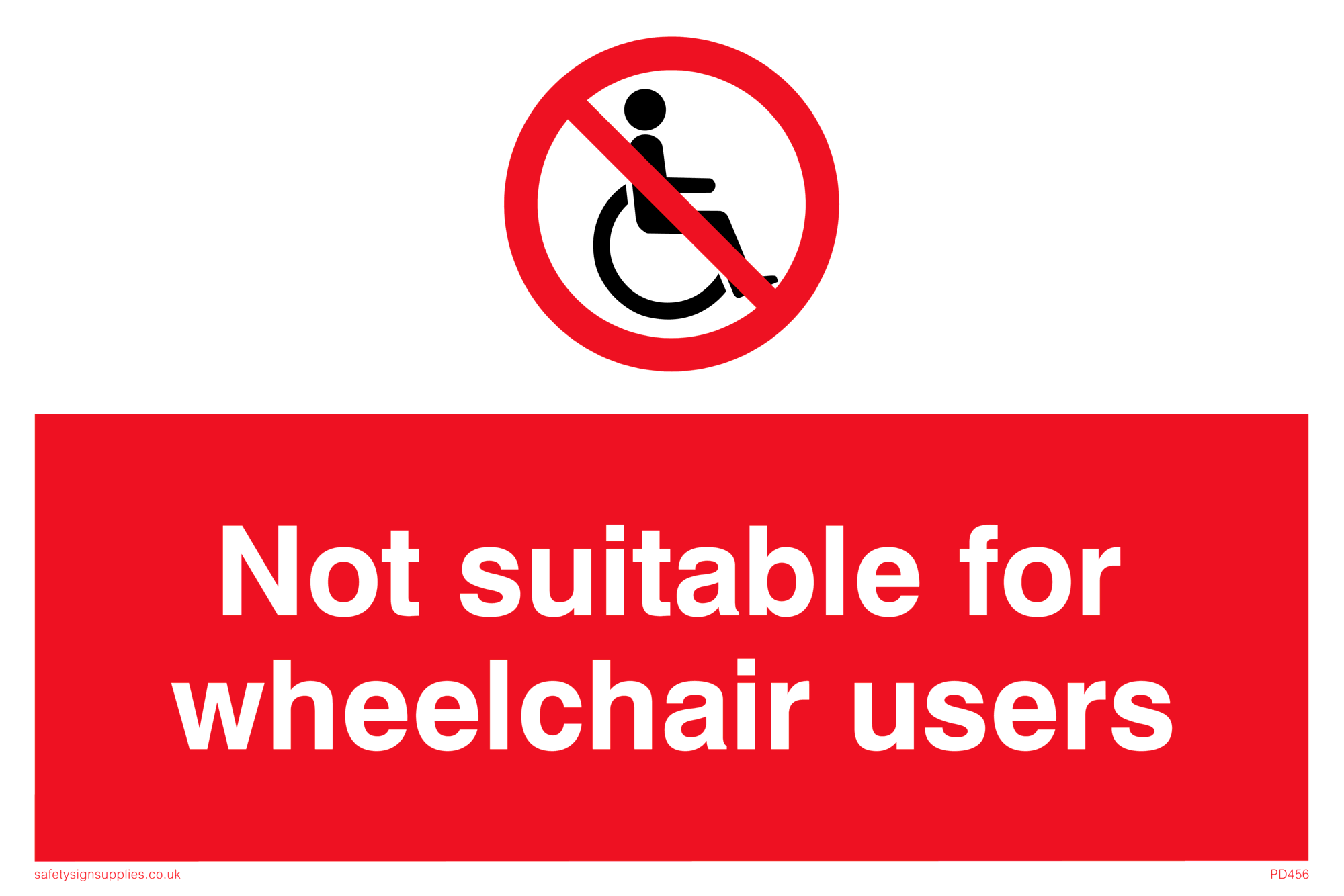 This sign contains a red prohibition circle and line diagonally crossed through. This sign contains a no wheelchairs symbol - wheelchair in black with red circle crossed through.