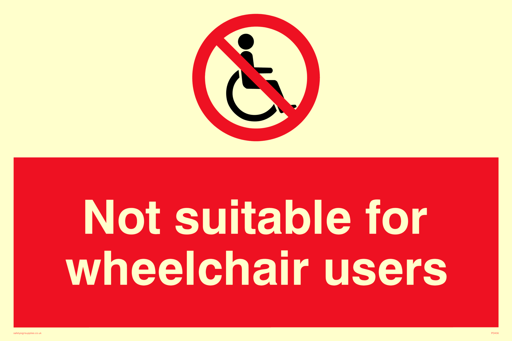 This sign contains a red prohibition circle and line diagonally crossed through. This sign contains a no wheelchairs symbol - wheelchair in black with red circle crossed through.
