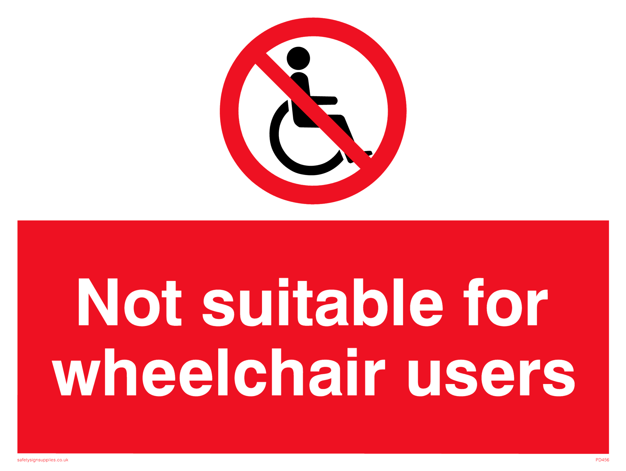 This sign contains a red prohibition circle and line diagonally crossed through. This sign contains a no wheelchairs symbol - wheelchair in black with red circle crossed through.