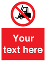 This sign contains a no fork lift trucks symbol - fork lift with red prohibition circle and line diagonally crossed through.
