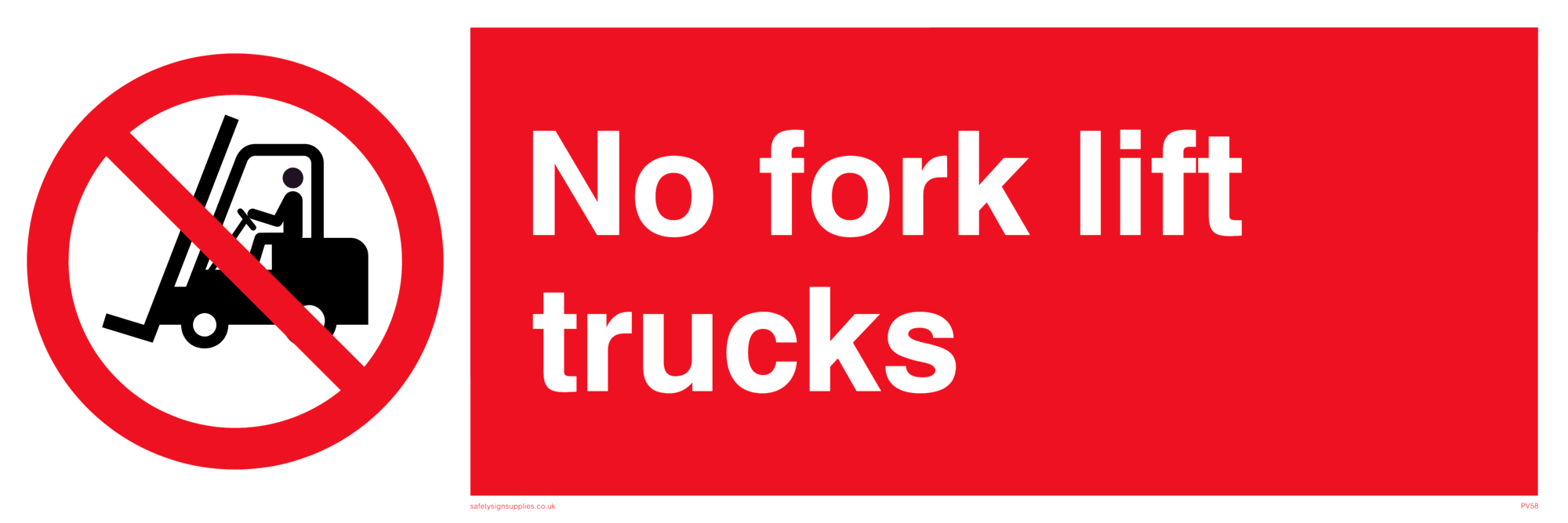This sign contains a no fork lift trucks symbol - fork lift with red prohibition circle and line diagonally crossed through.