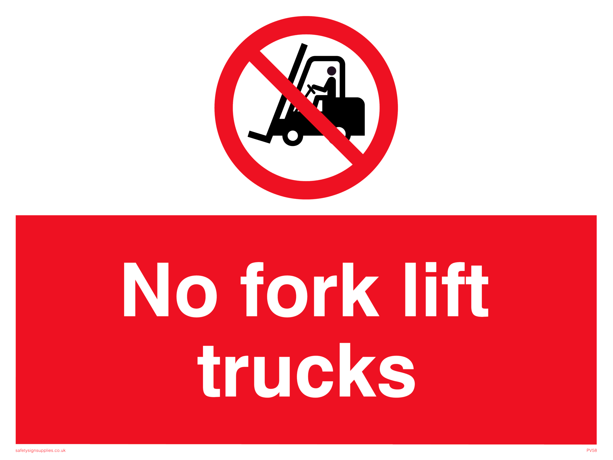 This sign contains a no fork lift trucks symbol - fork lift with red prohibition circle and line diagonally crossed through.