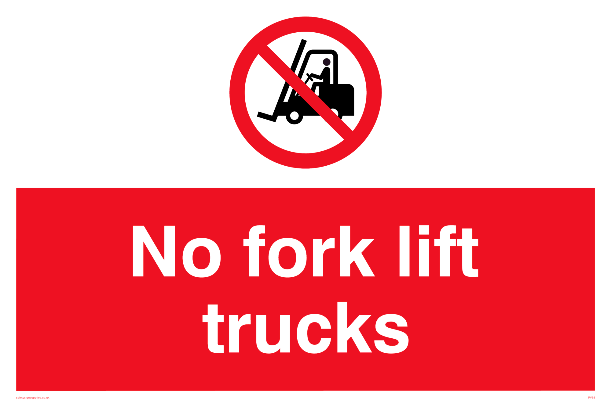 This sign contains a no fork lift trucks symbol - fork lift with red prohibition circle and line diagonally crossed through.