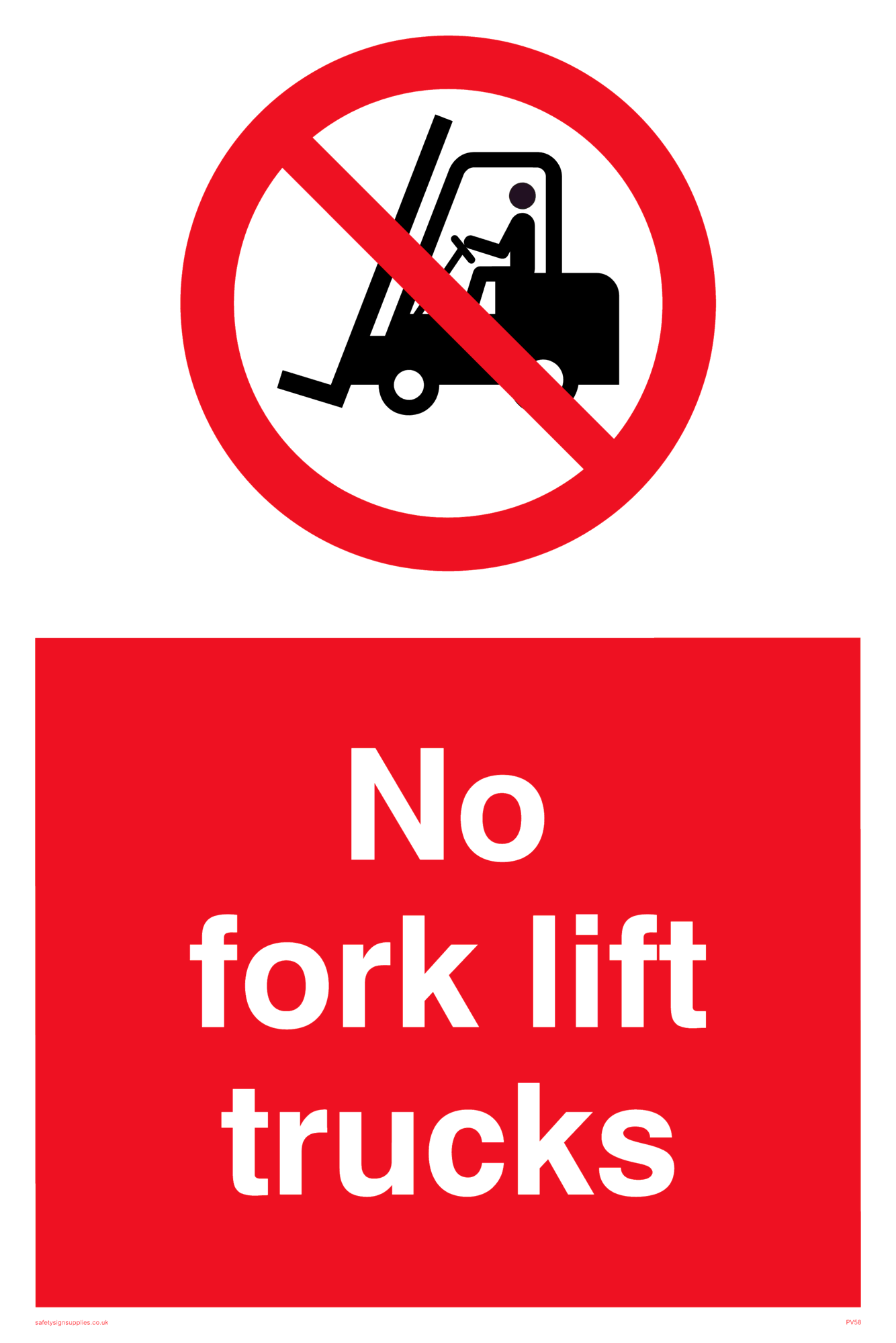 This sign contains a no fork lift trucks symbol - fork lift with red prohibition circle and line diagonally crossed through.