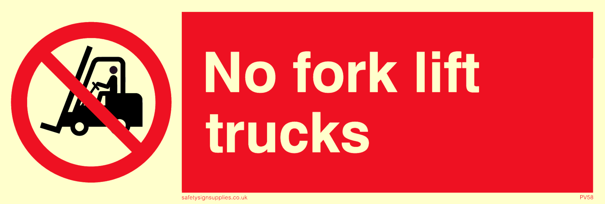 This sign contains a no fork lift trucks symbol - fork lift with red prohibition circle and line diagonally crossed through.