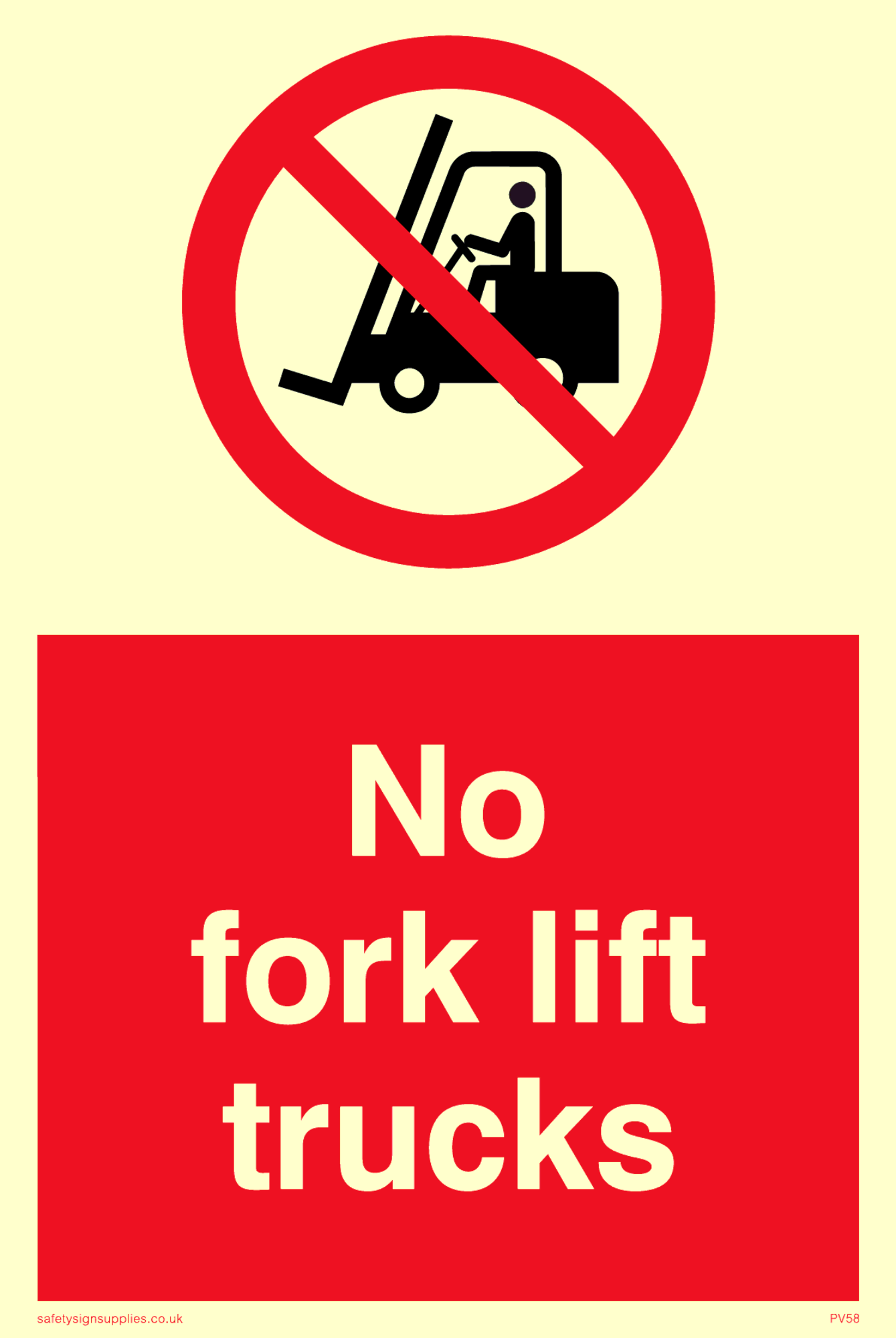 This sign contains a no fork lift trucks symbol - fork lift with red prohibition circle and line diagonally crossed through.