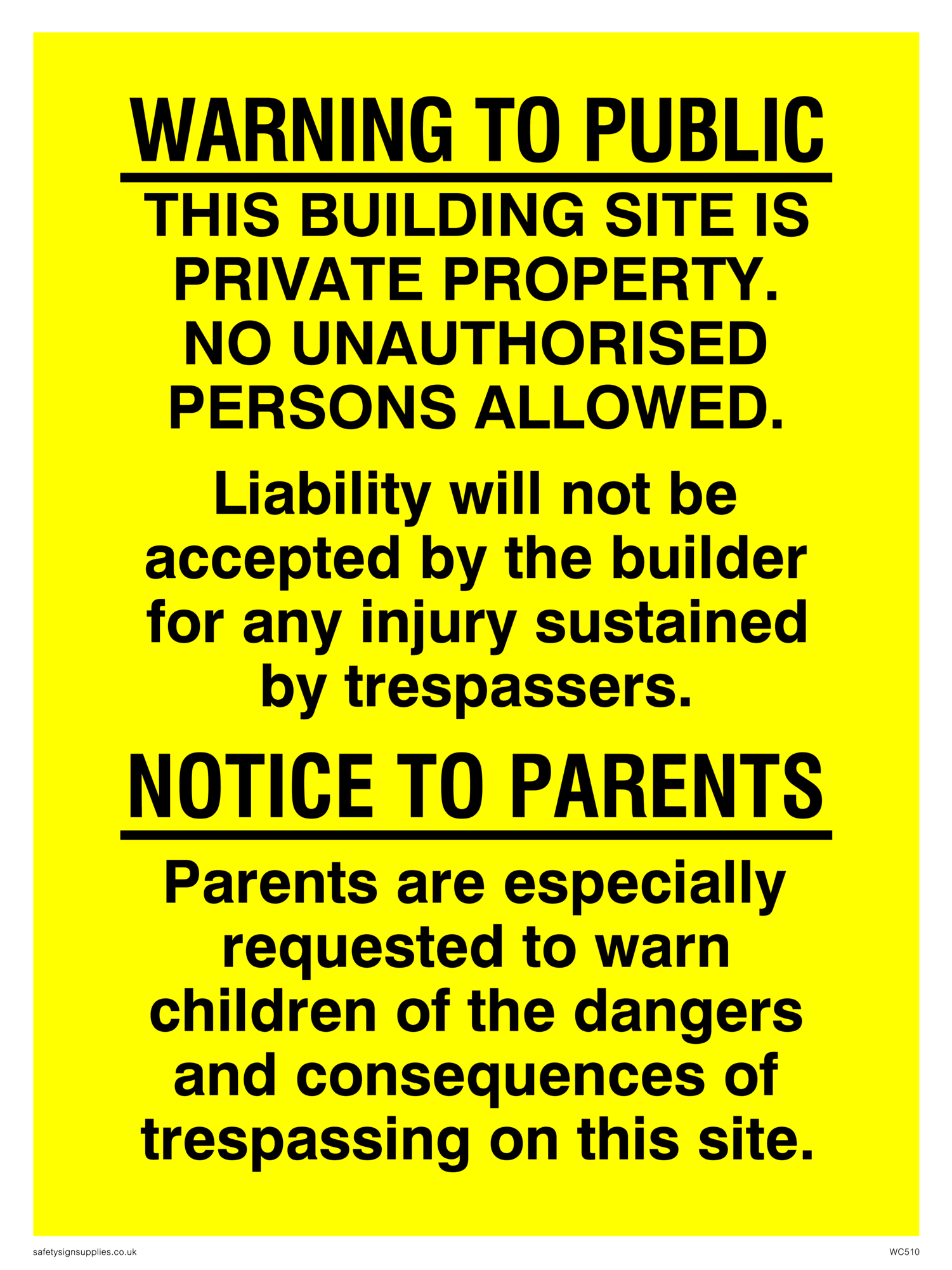 Sign Text: Warning to public this building site is private property. no unauthorised persons allowed. liability will not be accepted by the builder for any injury to trespassers. Notice to parents Parents are especially asked to warn children of the dangers and consequences of trespassing on this site.