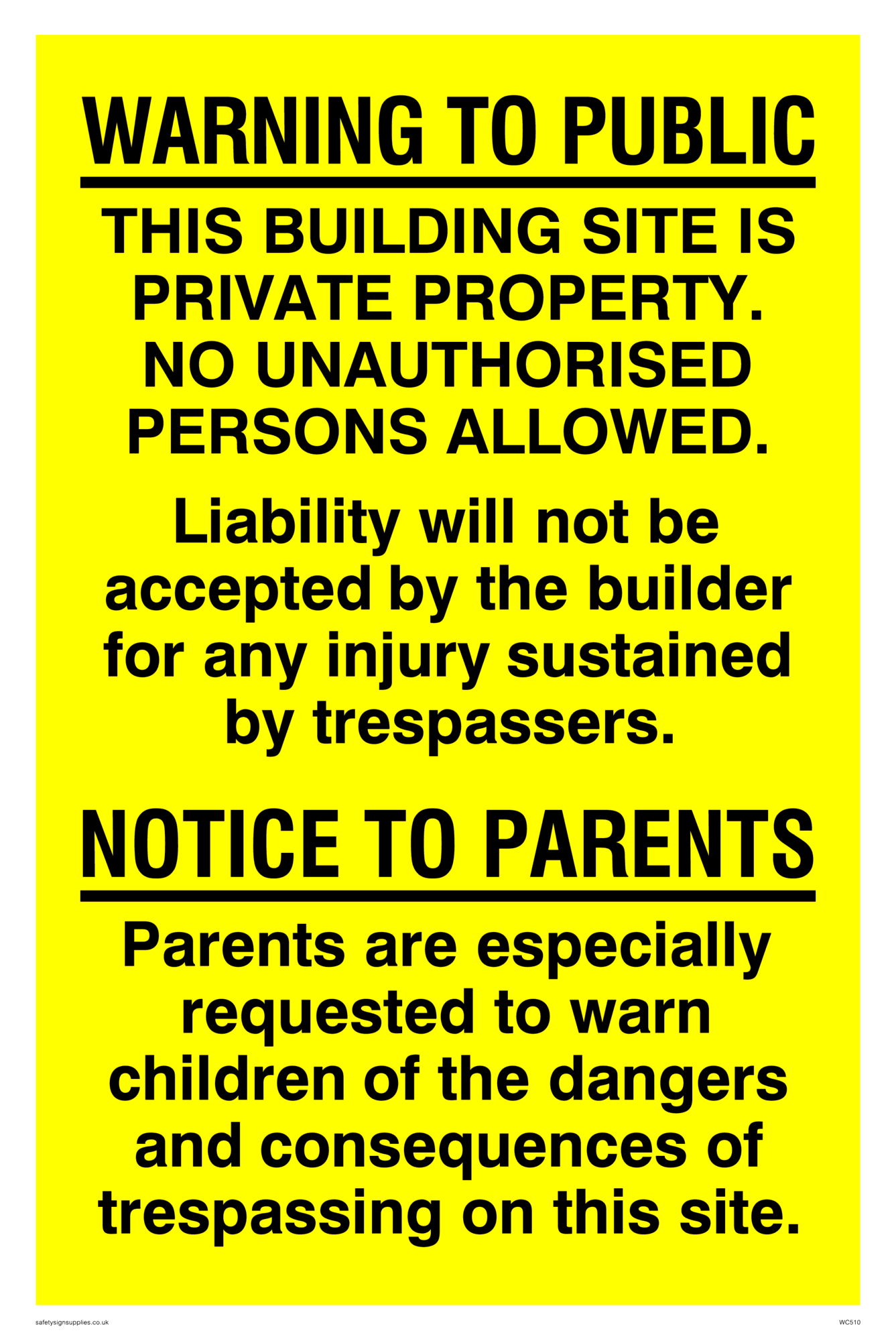Sign Text: Warning to public this building site is private property. no unauthorised persons allowed. liability will not be accepted by the builder for any injury to trespassers. Notice to parents Parents are especially asked to warn children of the dangers and consequences of trespassing on this site.