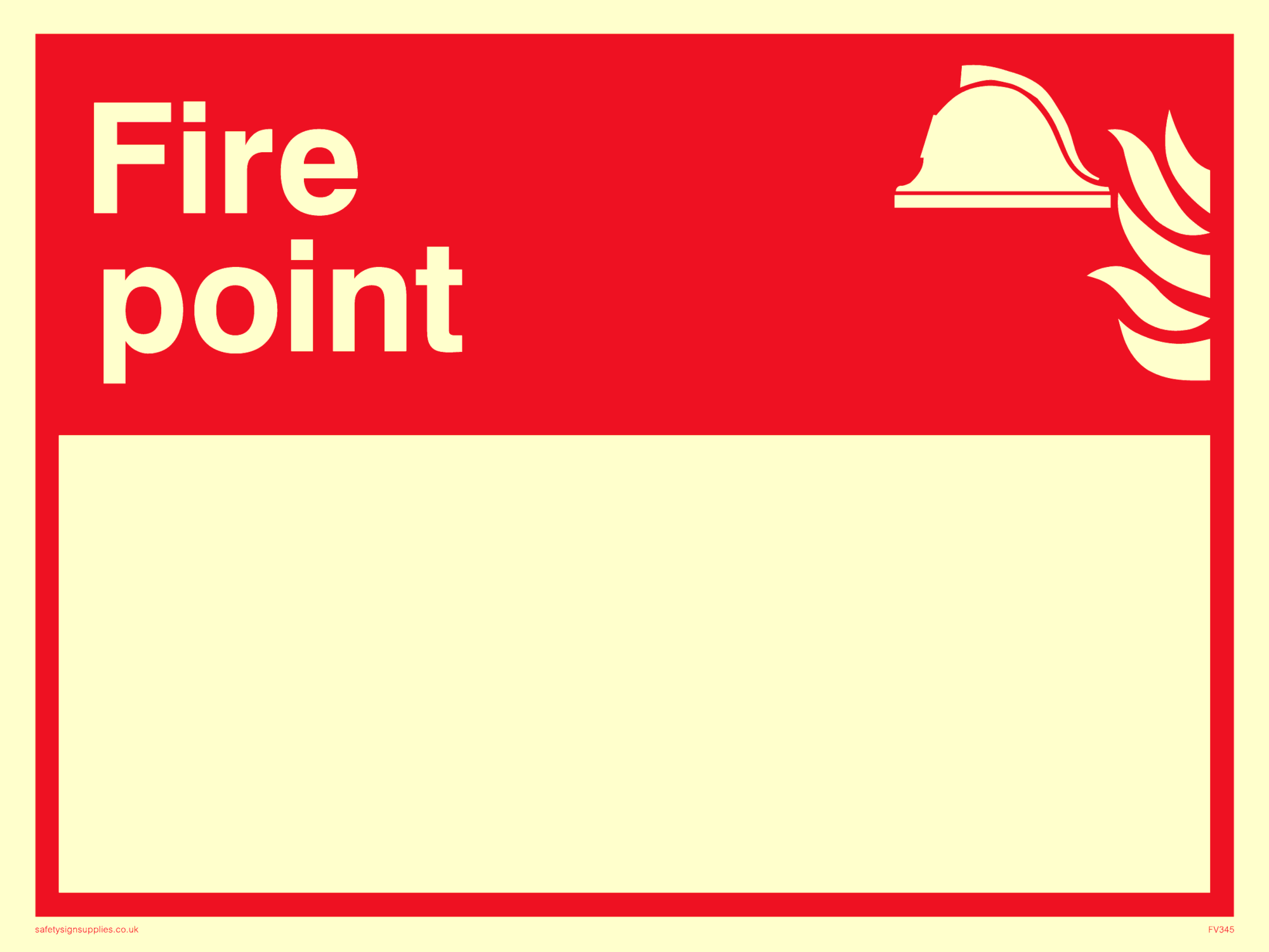 This sign contains a fire point symbol - firemans helmet in white on red background.