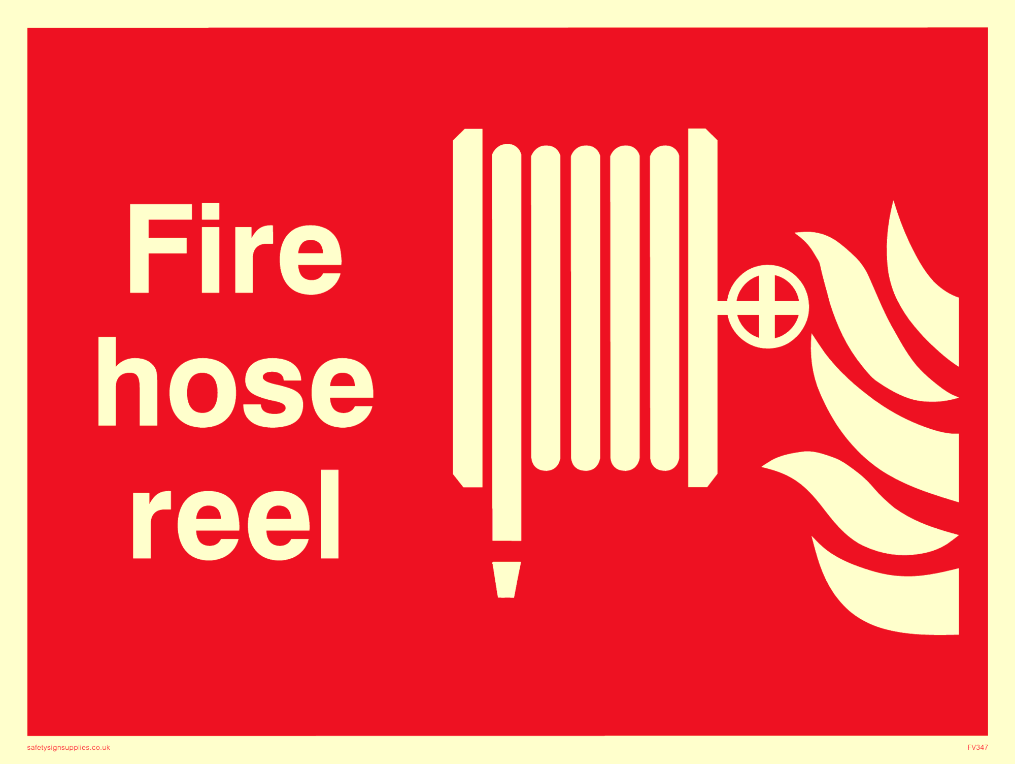 This sign contains a fire hose reel symbol - fire hose reel in white on red background.