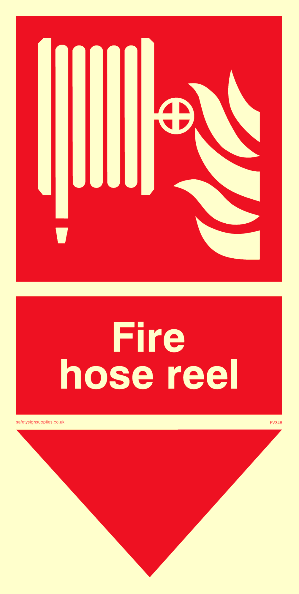 This sign contains a fire hose reel symbol - fire hose reel in white on red background.
