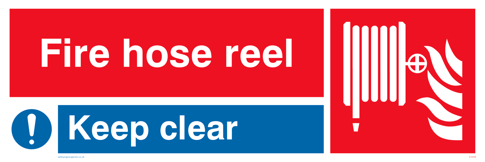 This sign contains a fire hose reel symbol - fire hose reel in white on red background.