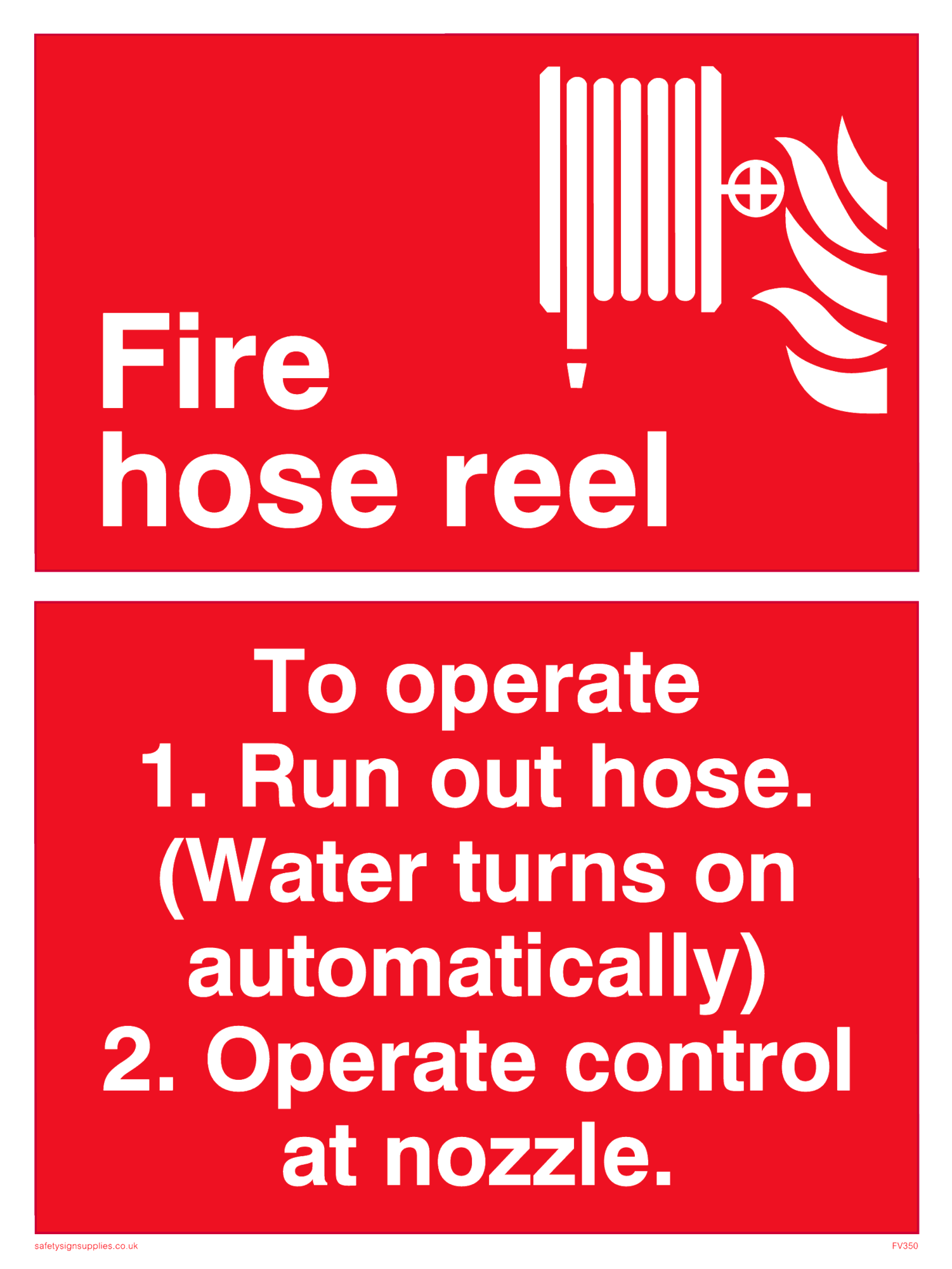 This sign contains a fire hose reel symbol - fire hose reel in white on red background.