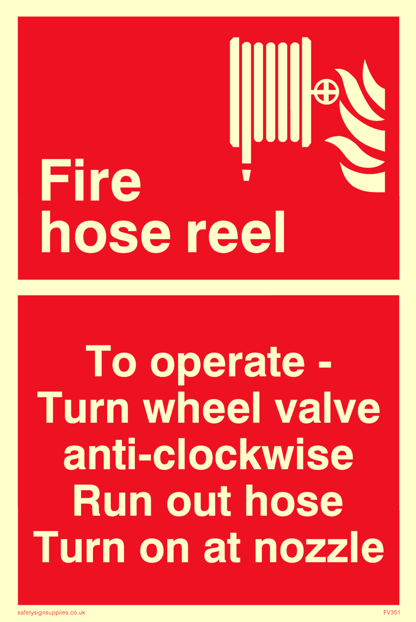 This sign contains a fire hose reel symbol - fire hose reel in white on red background.