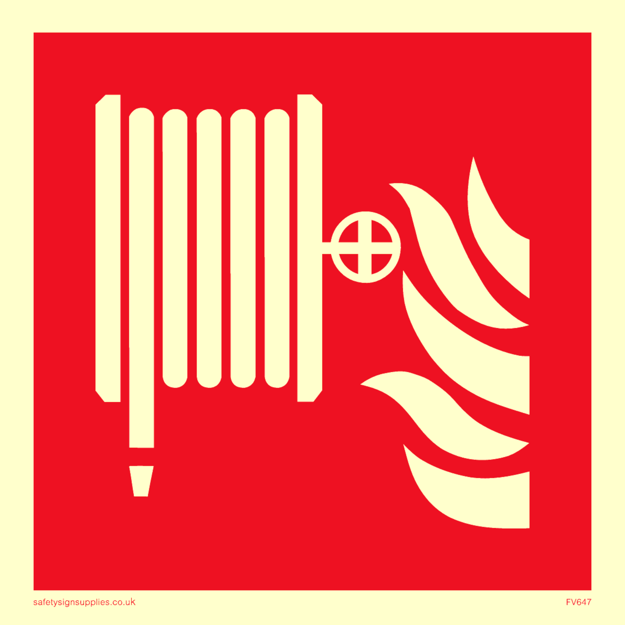 This sign contains a fire hose reel symbol - fire hose reel in white on red background.