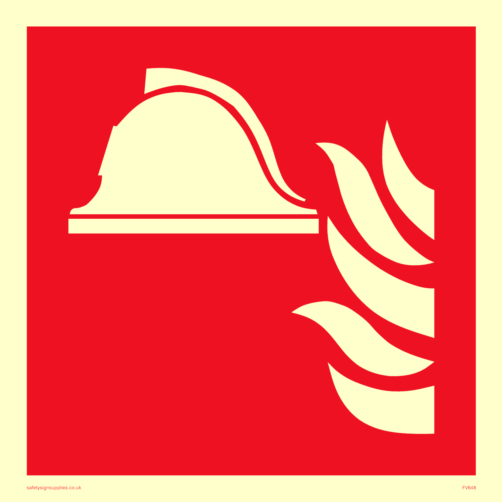 This sign contains a fire point symbol - firemans helmet in white on red background.