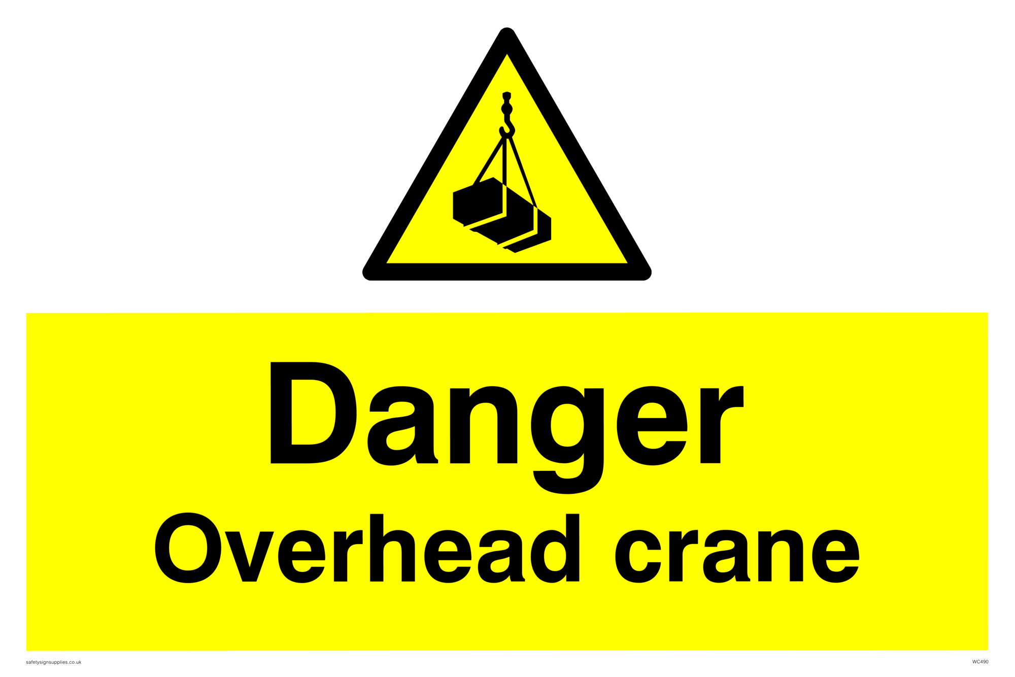 This sign contains a crane warning symbol. Crane hook with load in black within yellow triangle with black border.