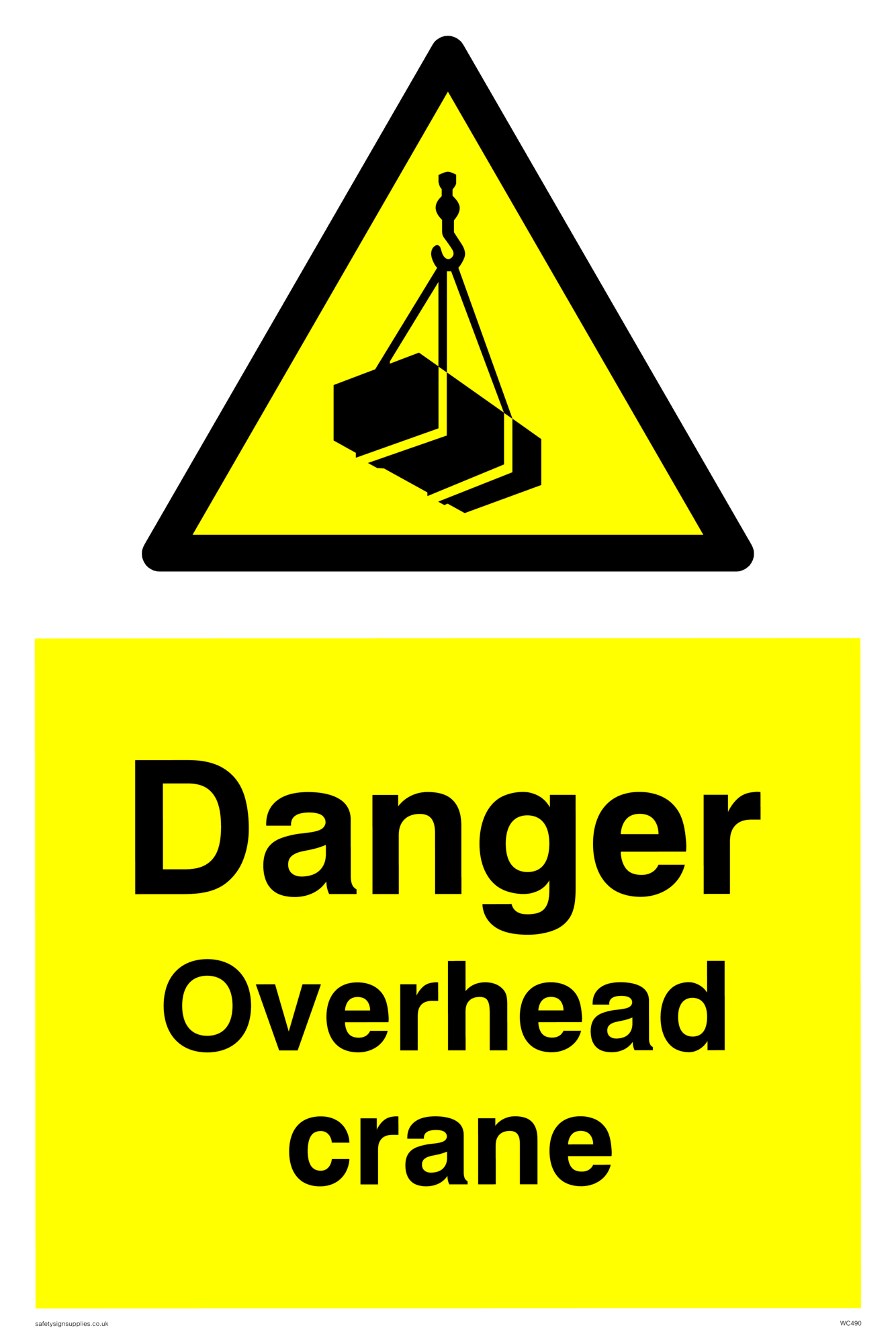 This sign contains a crane warning symbol. Crane hook with load in black within yellow triangle with black border.