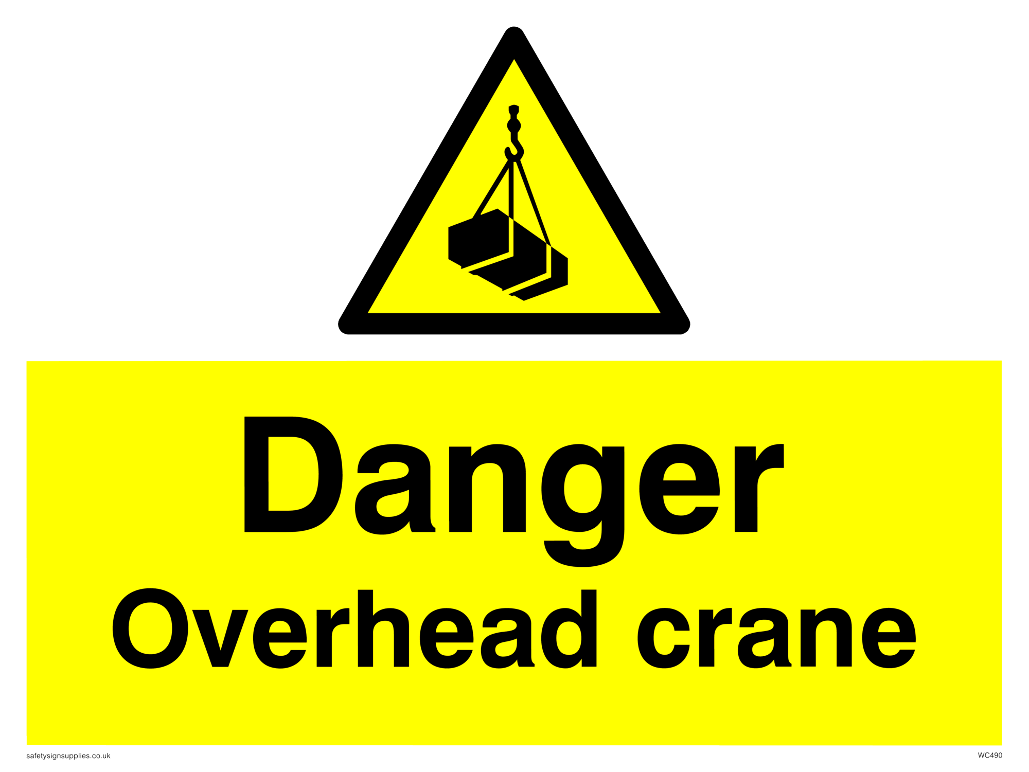 This sign contains a crane warning symbol. Crane hook with load in black within yellow triangle with black border.