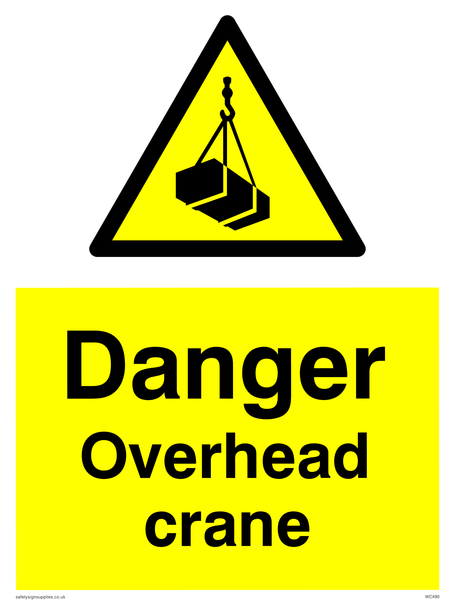 This sign contains a crane warning symbol. Crane hook with load in black within yellow triangle with black border.