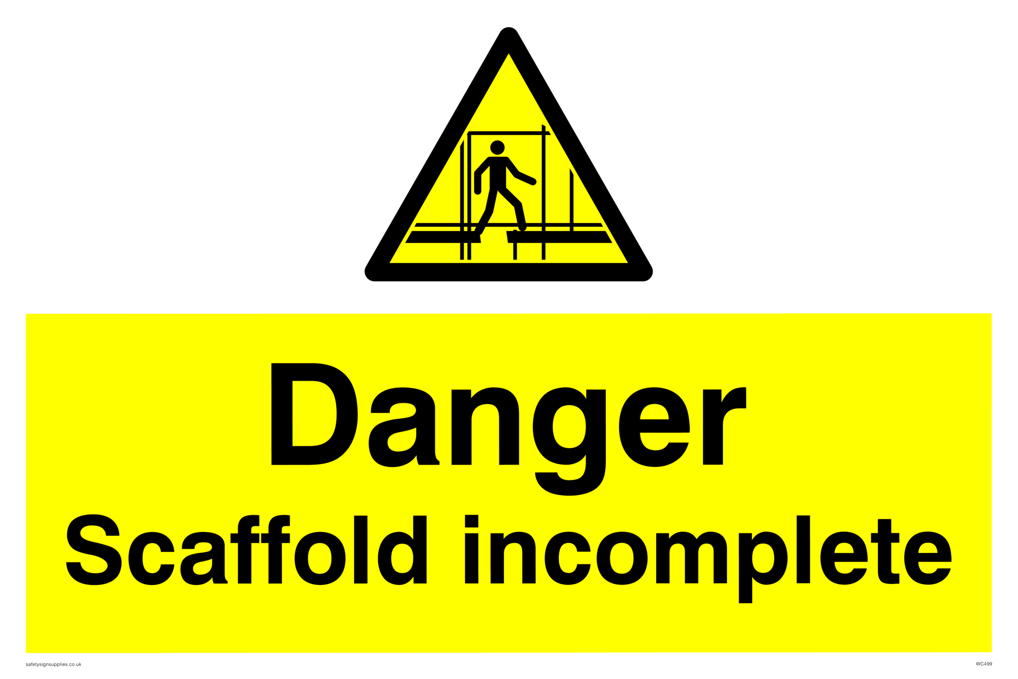 This sign contains scaffolding warning symbol - outline of a man on incomplete scaffolding in black on a yellow warning triangle with black border. Suitable for hanging with a budget hanging kit.