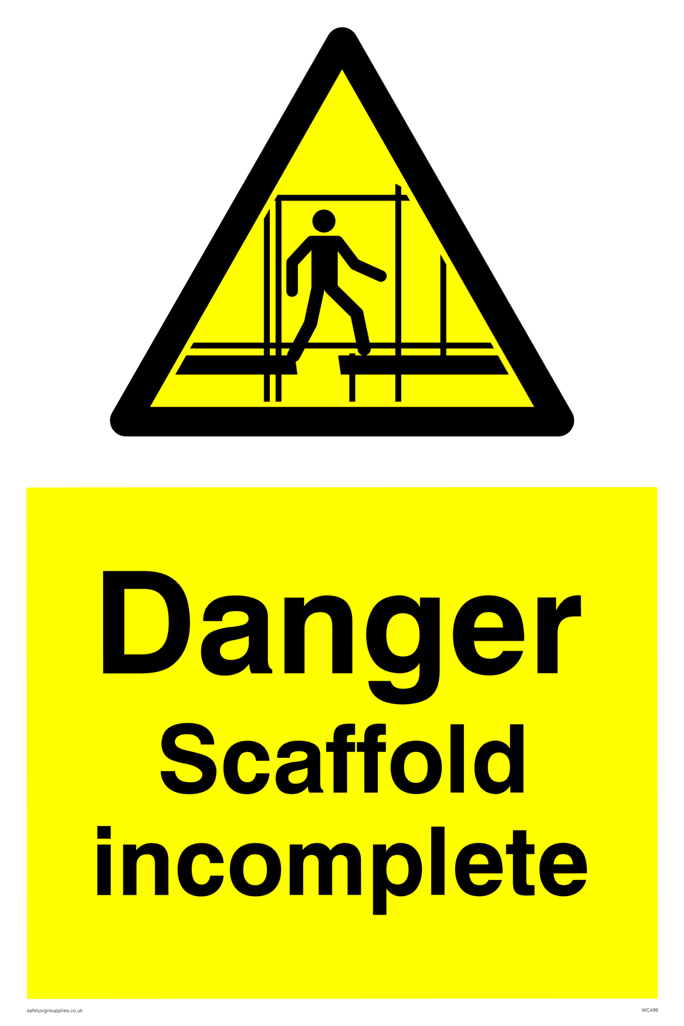 This sign contains scaffolding warning symbol - outline of a man on incomplete scaffolding in black on a yellow warning triangle with black border.