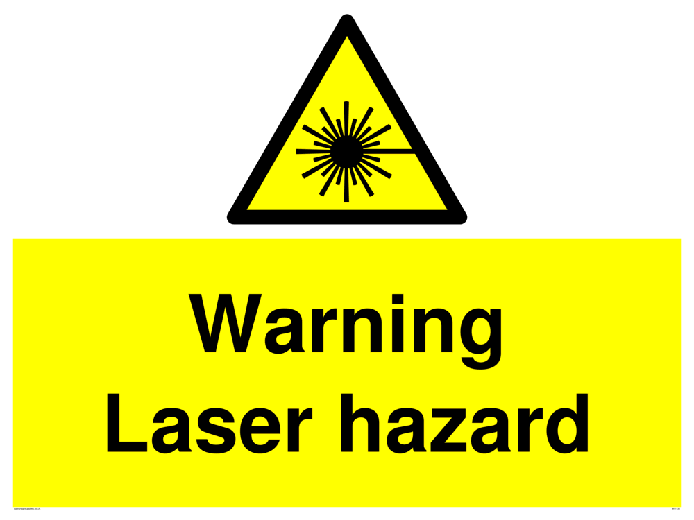 This sign contains an international standard laser warning symbol. Laser beam and star burst in black on yellow warning triangle with black border.
