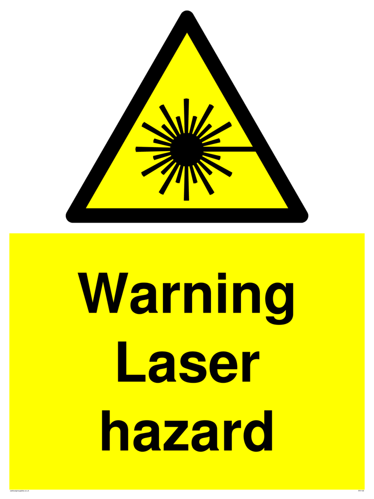 This sign contains an international standard laser warning symbol. Laser beam and star burst in black on yellow warning triangle with black border.