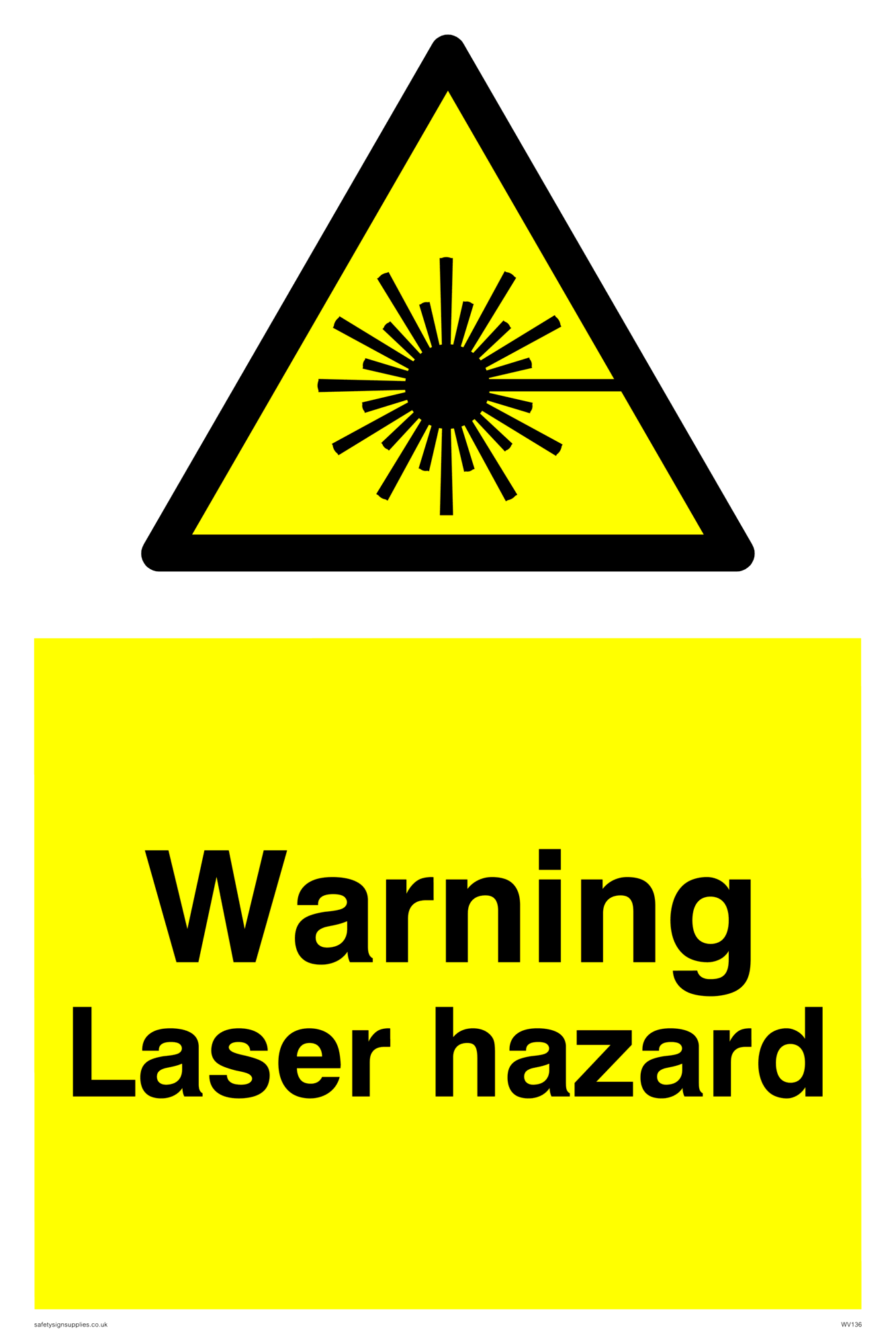 This sign contains an international standard laser warning symbol. Laser beam and star burst in black on yellow warning triangle with black border.